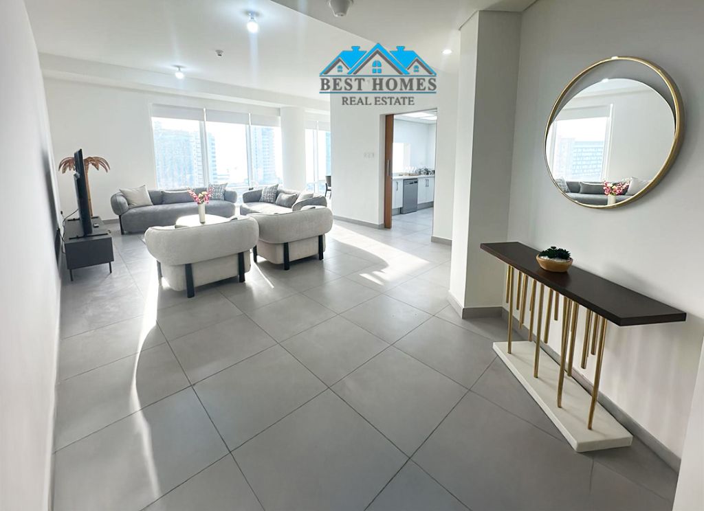 شقق ثلاث غرف نوم على الطراز الحديث مع اطلالة كاملة على البحر في مدينة الكويت. منطقة معيشة كبيرة مطبخ مع اجهزة 3 غرف نوم مع خزائن، غرفة خادمة حمامي سباحة ونادي رياضي منطقة لعب للاطفال منطقة شواء إيجار شبه مفروش يبدأ من 1100 دينار كويتي إيجار مفروش بالكامل يبدأ من 1250 دينار كويتي