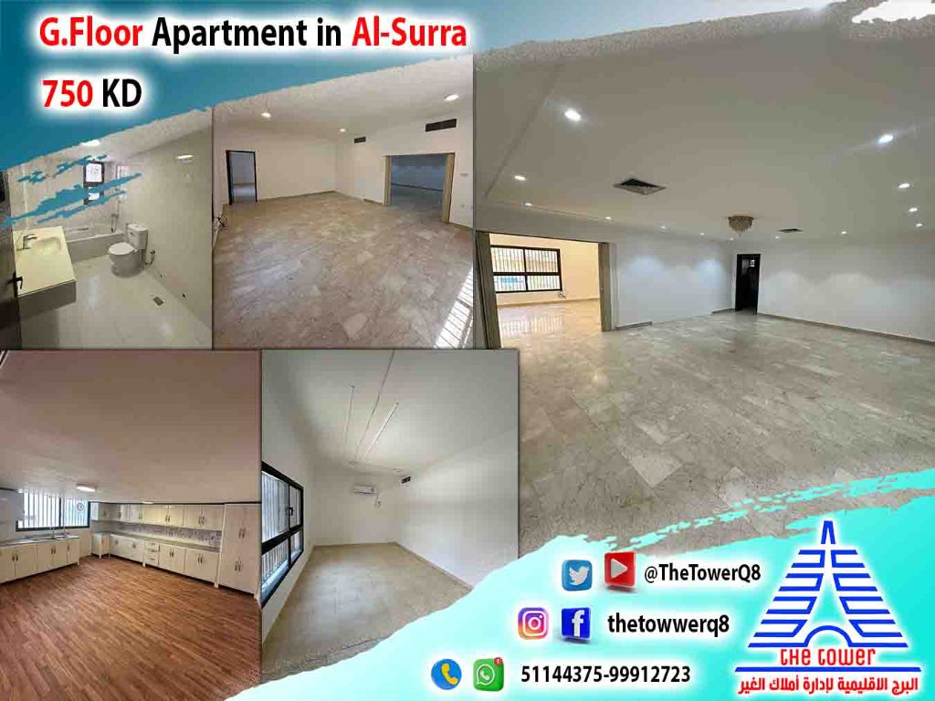 للإيجار في السرة، شقة أرضية بمساحات كبيرة، تشطيب سوبر ديلوكس، 4 غرف نوم (بما في ذلك غرفة ماستر وغرفتين بينهما حمام) صالة كبيرة مع حمام ضيوف ومغاسل، صالون كبير، غرفة مربية مع حمام، مطبخ كبير مجهز، ومواقف مظللة. الإيجار 750 دينار كويتي. للاستفسار