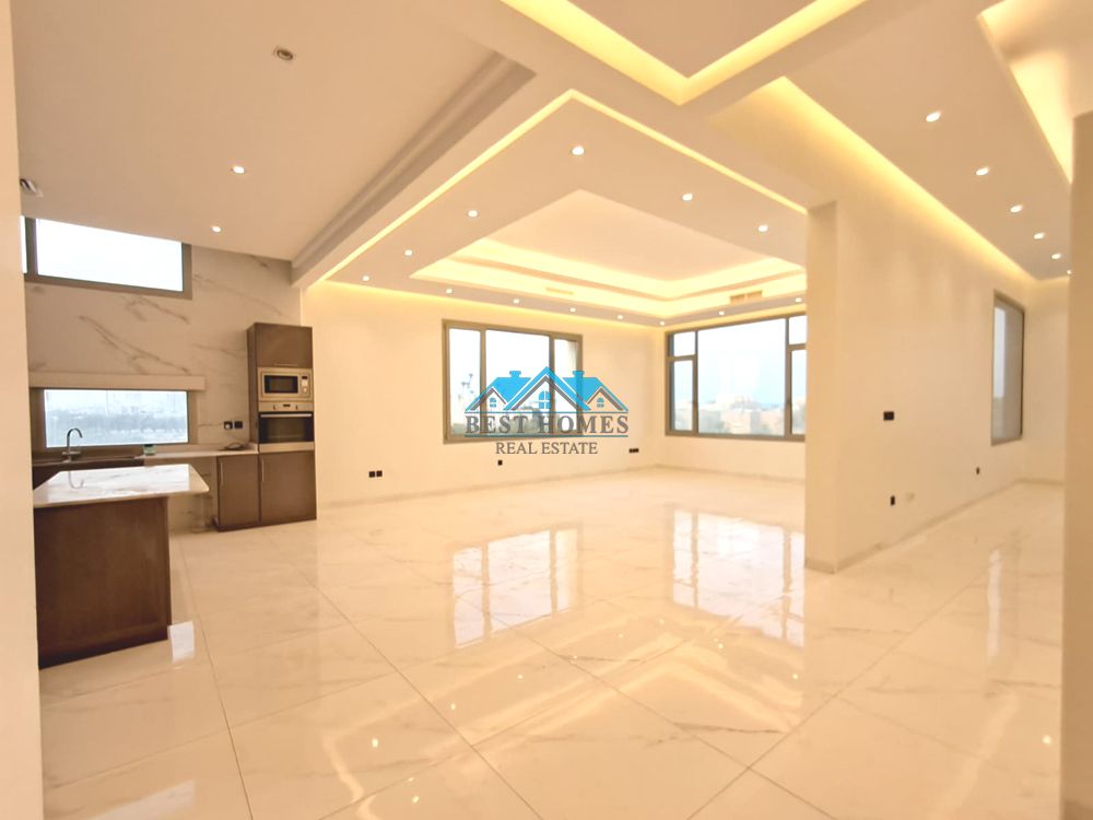 طابق حديث مكون من 4 غرف نوم مع اطلالة على البحر في السالمية. منطقتان معيشة مع شرفة مطلة على البحر. 4 غرف نوم رئيسية مع خزائن مدمجة. مطبخ مفتوح كبير. غرفة خادمة. موقفان للسيارات. الإيجار 1400 دينار كويتي. اتصل أو راسل عبر واتساب للمعاينة