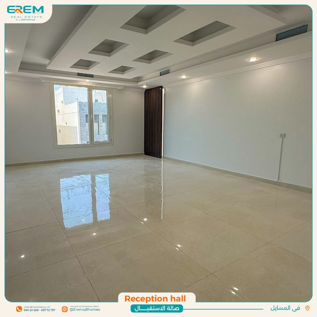 للإيجار في المسايل، شقة بتشطيب سوبر ديلوكس. تتكون من صالة مع حمام ضيوف، 3 غرف منها ماستر، مطبخ، غرفة مربية مع حمام، ومواقف مظللة. للإيجار بسعر 525 دينار كويتي. للاستفسار والمعاينة