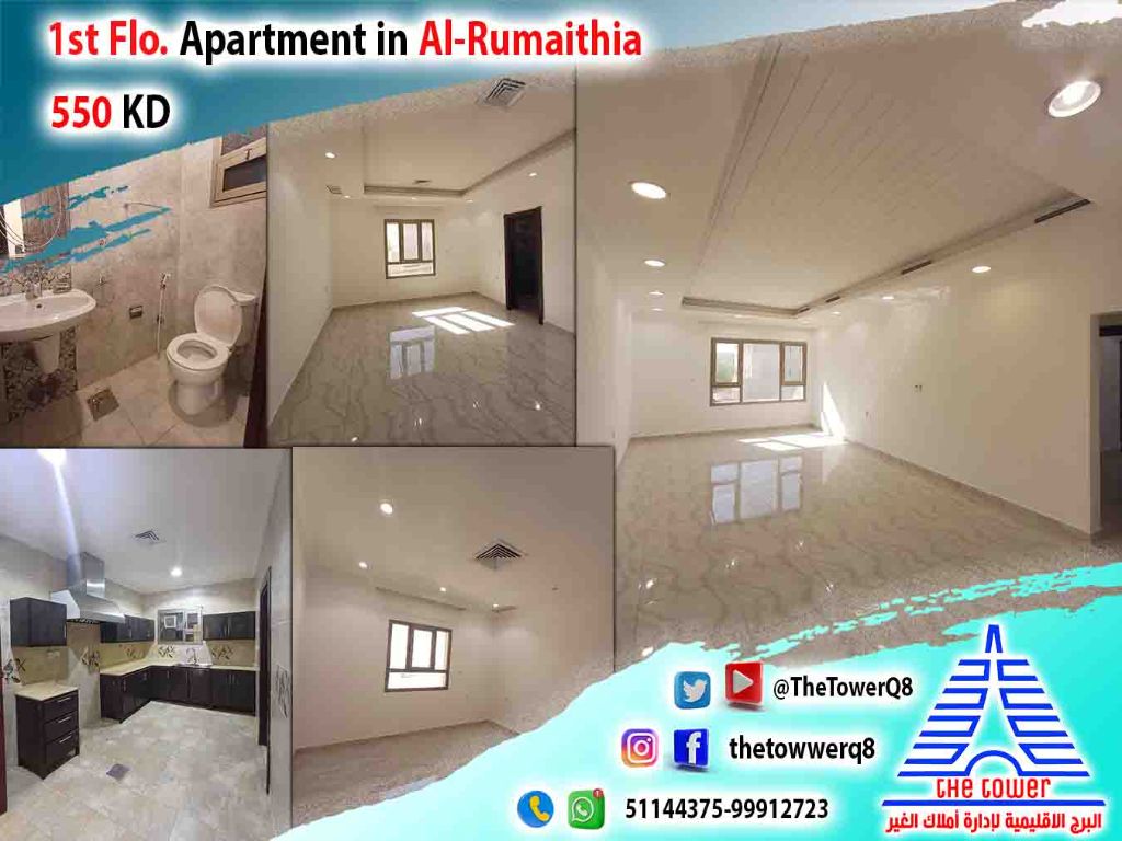 للإيجار في الرميثية - شقة دور أول - تشطيب سوبر ديلوكس - 3 غرف نوم كلها ماستر - صالة مع حمام ضيوف - غرفة مربية مع حمام - غرفة غسيل منفصلة - مطبخ مجهز - مواقف مظللة. الإيجار 550 دينار كويتي. للاستفسار