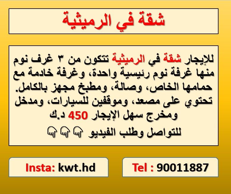 للإيجار شقة في الرميثية تتكون من 3 غرف نوم منها غرفة نوم رئيسية واحدة، وغرفة خادمة مع حمامها الخاص، وصالة، ومطبخ مجهز بالكامل. تحتوي على مصعد، وموقفين للسيارات، ومدخل ومخرج سهل. الإيجار 450 دينار كويتي. للتواصل وطلب الفيديو
