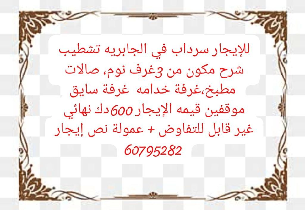 للإيجار: سرداب في الجابرية بمدخل ومخرج سهل. السرداب يتكون من ثلاث غرف نوم وصالات واسعة مع غرفة سائق رئيسية خارجية. للمستأجر موقفين للسيارات. قيمة الإيجار 600 دينار كويتي نهائي غير قابل للتفاوض، مع عمولة نصف الإيجار.