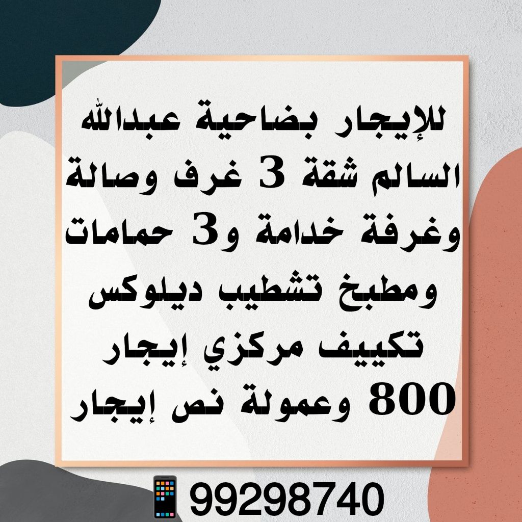 للإيجار في ضاحية عبدالله السالم، شقة مكونة من 3 غرف وصالة وغرفة عاملة منزلية و3 حمامات ومطبخ. تشطيب ديلوكس وتكييف مركزي. الإيجار 800 وعمولة نصف الإيجار.