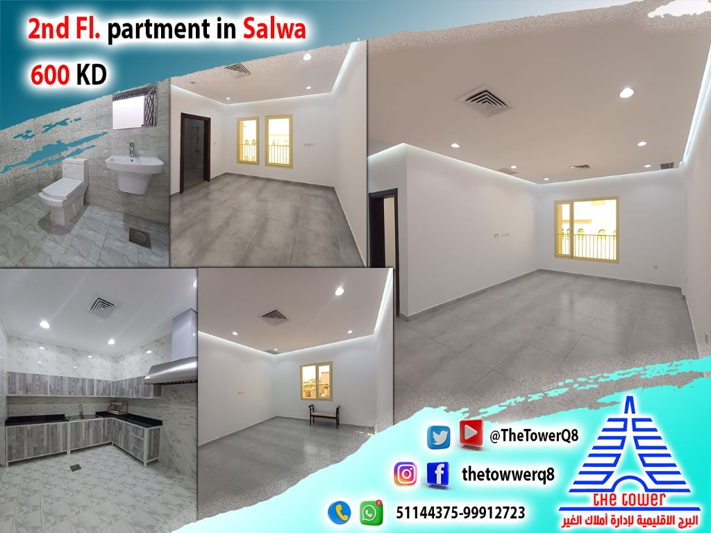 للإيجار في سلوى، شقة بتشطيب سوبر ديلوكس - 4 غرف نوم جميعها ماستر - صالة كبيرة مع حمام ضيوف - غرفة مربية مع حمام - غرفة غسيل منفصلة - مطبخ مجهز - مواقف مظللة. الإيجار 600 دينار كويتي. للاستفسار.