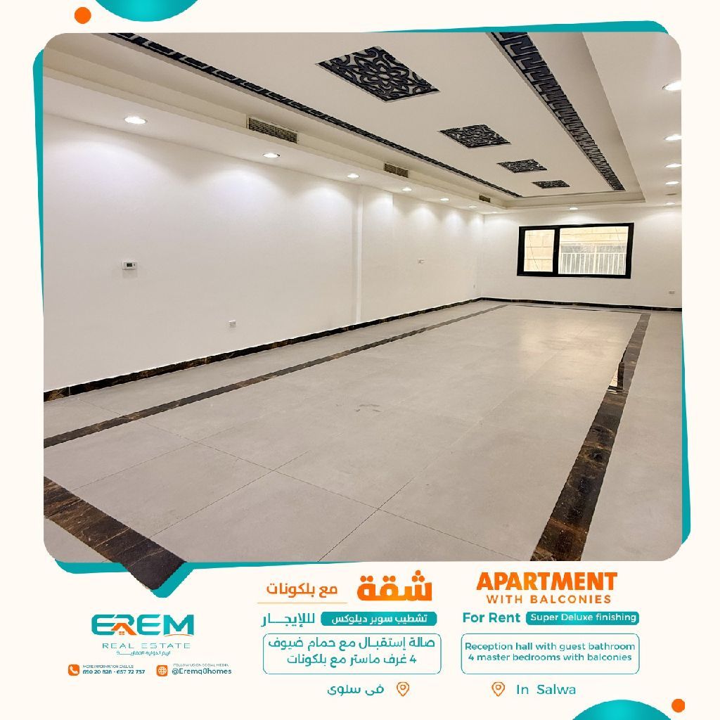 للإيجار في سلوى، شقة 4 غرف نوم ماستر وبلكونات، تشطيب سوبر ديلوكس. تتكون من صالة مع حمام ضيوف، 4 غرف نوم ماستر مع بلكونات، مطبخ، غرفة غسيل، غرفة مربية مع حمام، ومواقف مظللة. الإيجار 670 دينار كويتي. الكود RA - SL - 126