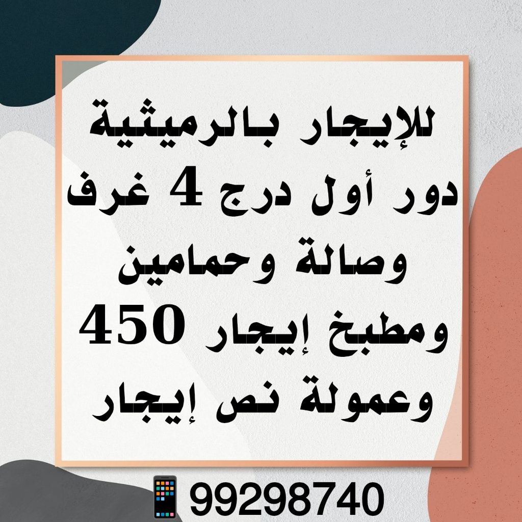 للإيجار في الرميثية، دور أول، درج، 4 غرف، صالة، حمامين، ومطبخ. الإيجار 450، والعمولة نصف الإيجار