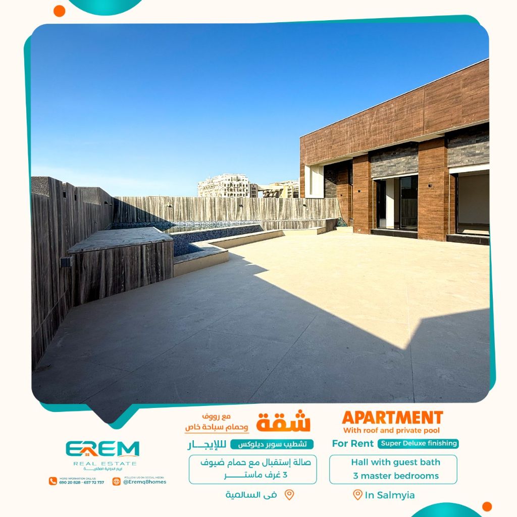 للإيجار في السالمية، شقة مع رووف وحمام سباحة خاص - أول ساكن، تشطيب سوبر ديلوكس. تتكون من صالة استقبال مع حمام ضيوف، رووف مع حمام سباحة، 3 غرف ماستر، مطبخ، غرفة مربية مع حمام، ومواقف مظللة. الإيجار 1000 دينار كويتي.