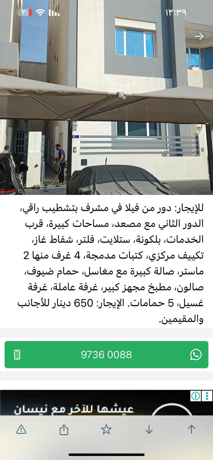 للإيجار: دور من فيلا في مشرف بتشطيب راقي، الدور الثاني مع مصعد، مساحات كبيرة، قرب الخدمات، بلكونة، ستلايت، فلتر، شفاط غاز، تكييف مركزي، كتبات مدمجة، 4 غرف منها 2 ماستر، صالة كبيرة مع مغاسل، حمام ضيوف، صالون، مطبخ مجهز كبير، غرفة عاملة، غرفة غسيل، 5 حمامات. الإيجار: 650 دينار للأجانب والمقيمين.