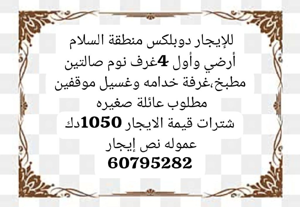 للإيجار: دوبلكس في منطقة السلام - طابق أرضي وأول. الطابق الأرضي: صالة مع مغاسل وحمام ضيوف، مطبخ، غرفة عامل منزلي، وغسيل. الطابق الأول: 4 غرف نوم منها 2 ماستر، صالة، منور، وبلكونة. البيت كل شترات، موقفين، وجيم. قيمة الإيجار: 1050 دينار كويتي + عمولة نصف إيجار. مطلوب عائلة صغيرة.