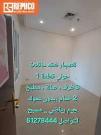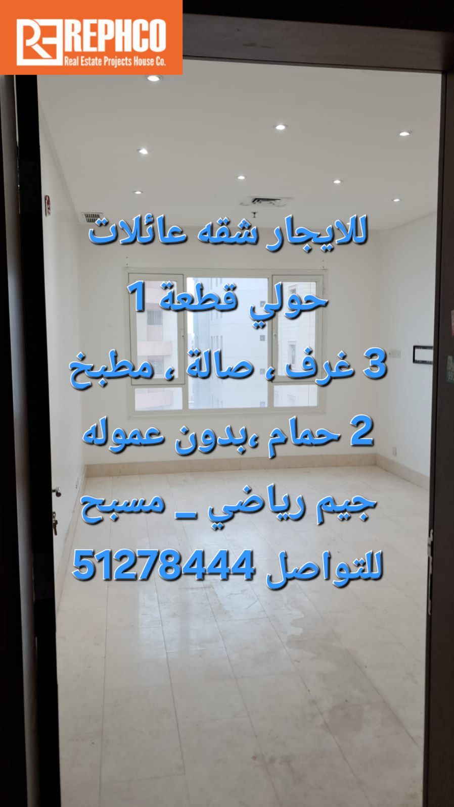 للإيجار شقة عائلات حولي قطعة 1، 3 غرف صالة - مطبخ - 2 حمام. يوجد مسبح جيم رياضي. للتواصل بدون عمولة