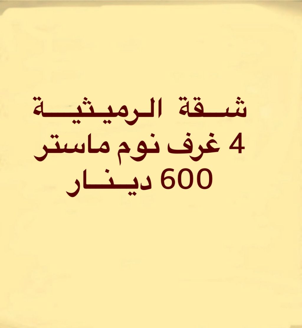 للإيجار شقة في الرميثية سوبر ديلوكس، تتكون من 4 غرف نوم ماستر، صالة مع حمام ضيوف، غرفة عاملة مع حمامها، مطبخ مجهز، وموقفين مظللين. يوجد ساحة. الإيجار 600 دينار نهائي. للاستفسار