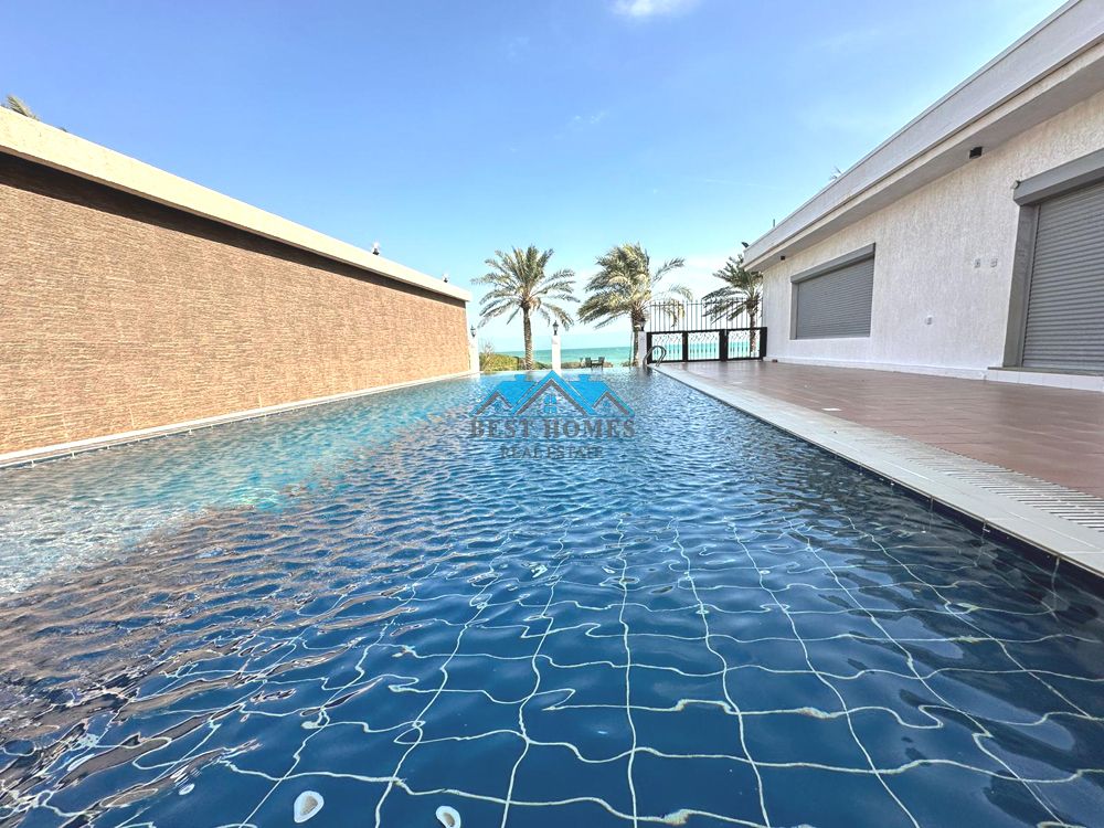 شقة أرضية بثلاث غرف نوم مطلة على الشاطئ في أبو الحسانية. الشقة الأرضية تتمتع باطلالة على الشاطئ، منطقة معيشة واسعة، حمام ضيوف، غرفة نوم رئيسية واحدة، غرفتي نوم عاديتين بحمام مشترك، مطبخ مفتوح مجهز، مسبح، حديقة، وموقفين للسيارات مظللين. الإيجار 1300 دينار كويتي