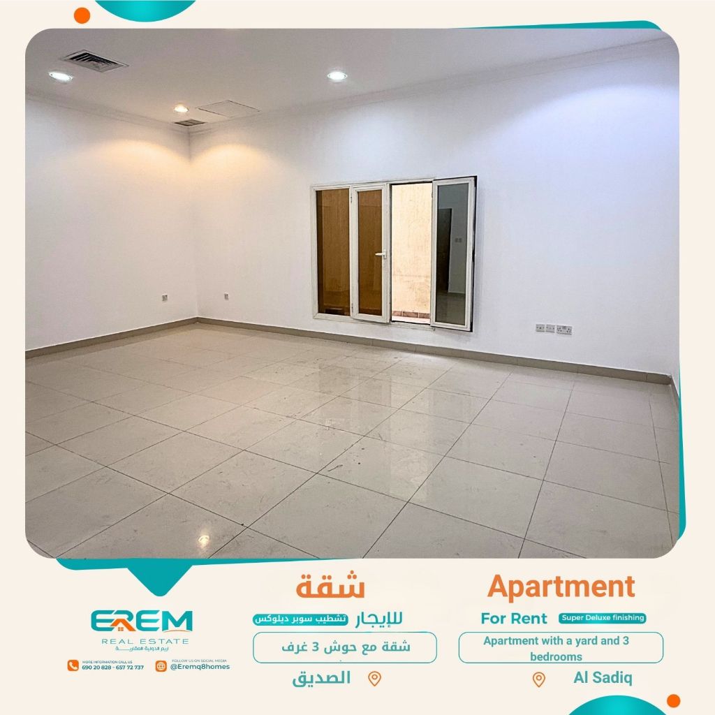 للإيجار في الصديق، شقة مع حوش، تشطيب سوبر ديلوكس. تتكون من صالة مع حمام ضيوف، 3 غرف منها ماستر، مطبخ، غرفة مربية مع حمام، ومواقف مظللة. الإيجار 450 دينار كويتي. الكود: RA-SD-66.