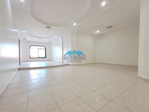 شقة أرضية فسيحة بأربع غرف نوم في منطقة السلام. تتميز بمنطقة معيشة كبيرة، وغرفتي نوم رئيسيتين، وغرفتي نوم عاديتين مع حمام مشترك، ومطبخ، وغرفة خادمة، وغرفة سائق، ومواقف لأربع سيارات. الإيجار 1000 دينار كويتي