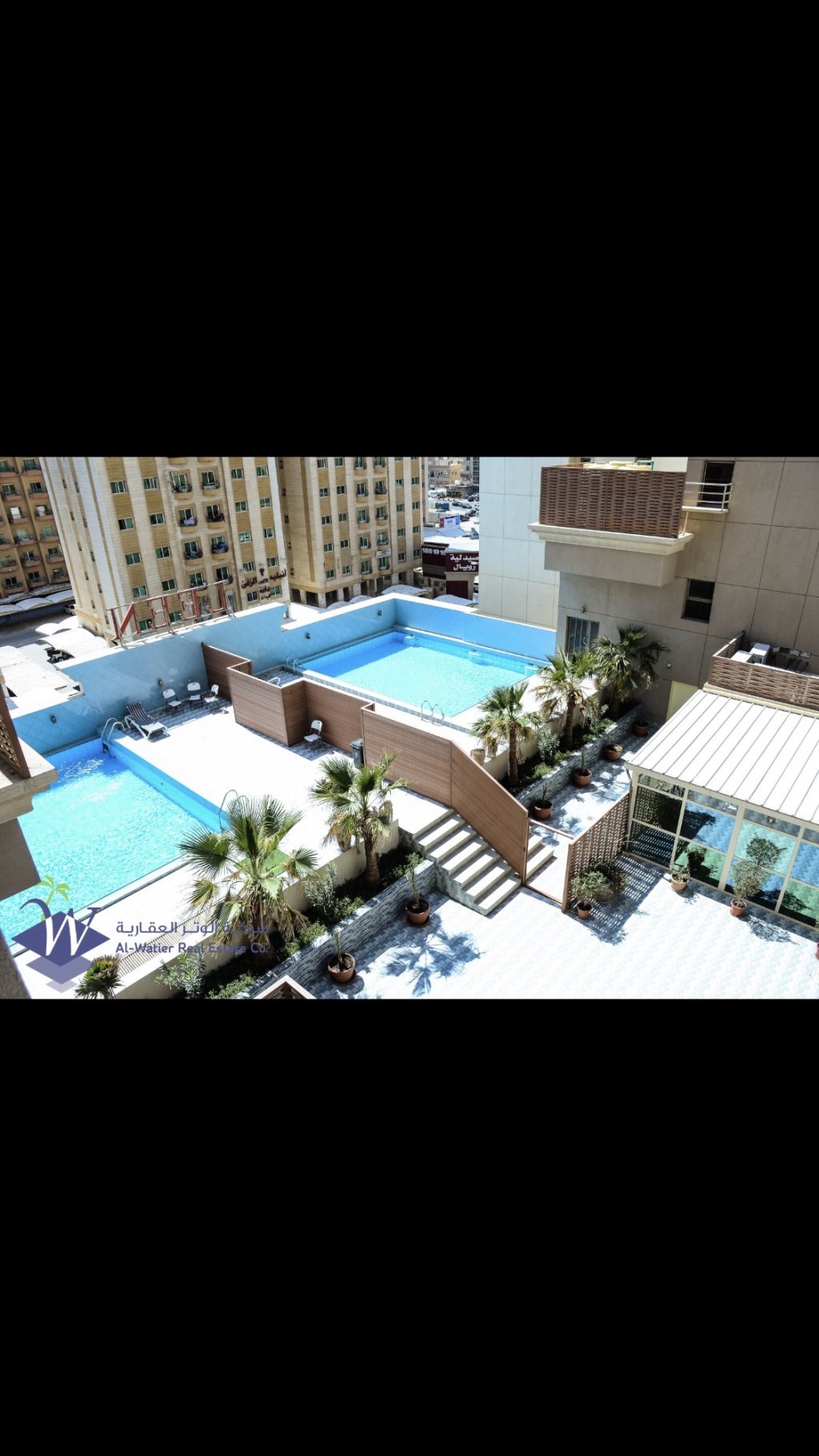 A room and hall with a sea view, available furnished and unfurnished. Sea view in an upscale complex in Salmiya with luxurious finishing, marble floors, and a large kitchen. Services include swimming pools, a gym, parking spaces, internet, a reception lobby, surveillance cameras, electronic gates, and parking spaces.