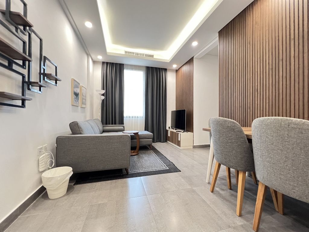 Salmiya - A very beautiful furnished apartment with two bedrooms, two bathrooms, a kitchen, a living room, shaded parking, a small pool, and a good gym. Rent is 500 Kuwaiti Dinars per month. Please contact Horizon K8 Real Estate Company. One-month rental insurance applies, and real estate fees equal half a month's rent. The map location is for guidance purposes.