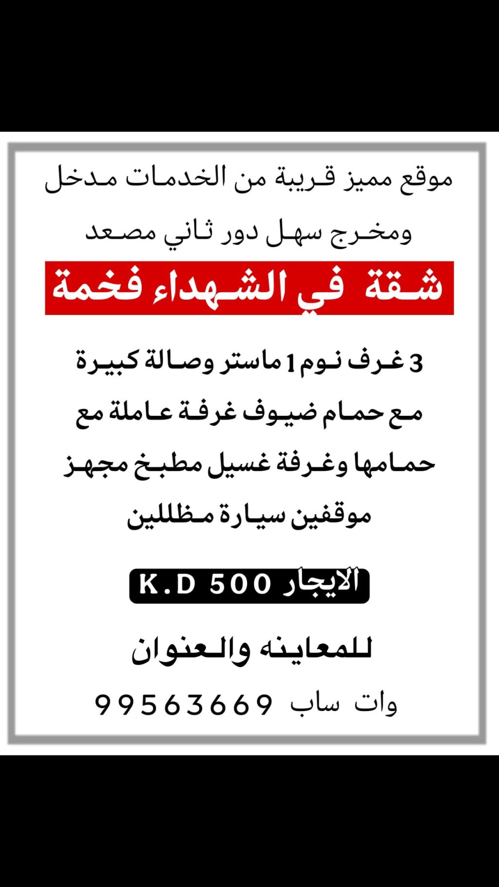 For rent, an apartment in Al - Shuhada with a prime location, deluxe finishing, and easy access. It consists of 3 bedrooms, including 1 master bedroom with two rooms sharing a bathroom, a large living room with a guest bathroom, a maid's room with its own bathroom, a laundry room, and a fully equipped kitchen. Two car parking spaces are available. A small family is preferred. The rent is 500 dinars
