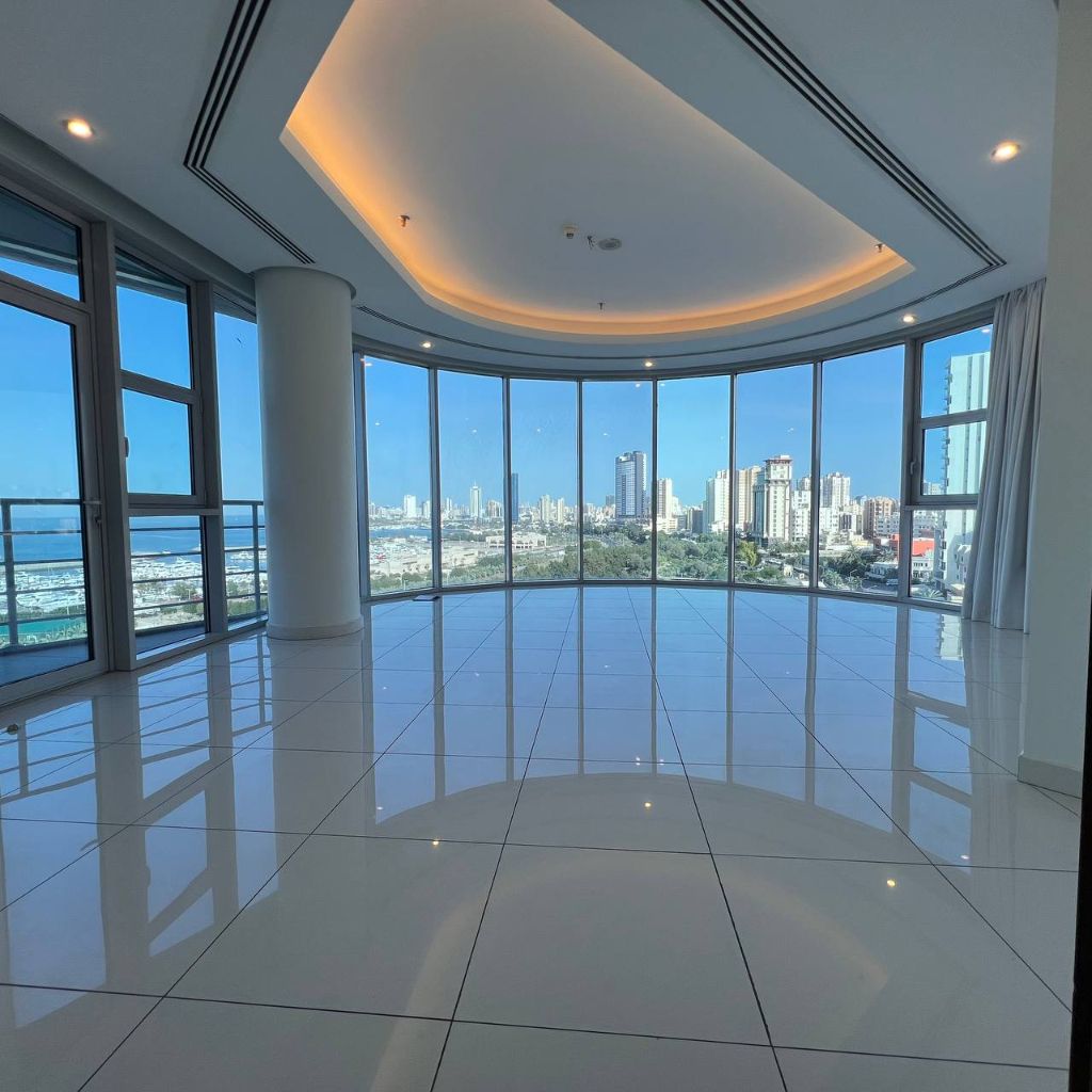 A residential floor with a direct sea view for rent in Salmiya, Block 11. Very prime location, direct sea view. It consists of 3 bedrooms, all master bedrooms, a living room, a kitchen, 5 bathrooms, a maid's room with its own bathroom, a laundry room, a balcony. Available in the building gym, swimming pool, reception lobby, 24 - hour security system, cameras, internet, intercom, children'play area