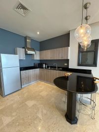 For rent in Salmiya, spacious one-bedroom apartments with a sea view. A large living room. A fully equipped open American kitchen. One bedroom. One bathroom. Rent starts from 450 to 550 Kuwaiti dinars depending on the floor. One month security deposit. Real estate brokerage fee is half a month. Amenities include a swimming pool, gym, underground parking, and cleaning service. Ultra Homes Property Management Company. We guarantee the best. We have apartments, villas, residential and commercial floors, and shops.
