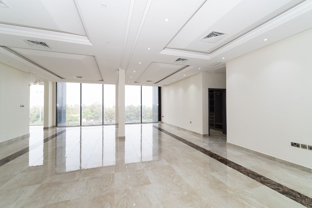 An apartment in Salmiya contains 4 bedrooms, 4 bathrooms, a living room, and a fully equipped kitchen. It includes a space for domestic workers and laundry, shaded parking for two cars, and a shared pool. High-quality finishing. Some units include a balcony. The rent is 1350 Kuwaiti Dinars per month. Please contact Horizon KW8 Real Estate Company. One month's rent is applied as a security deposit.