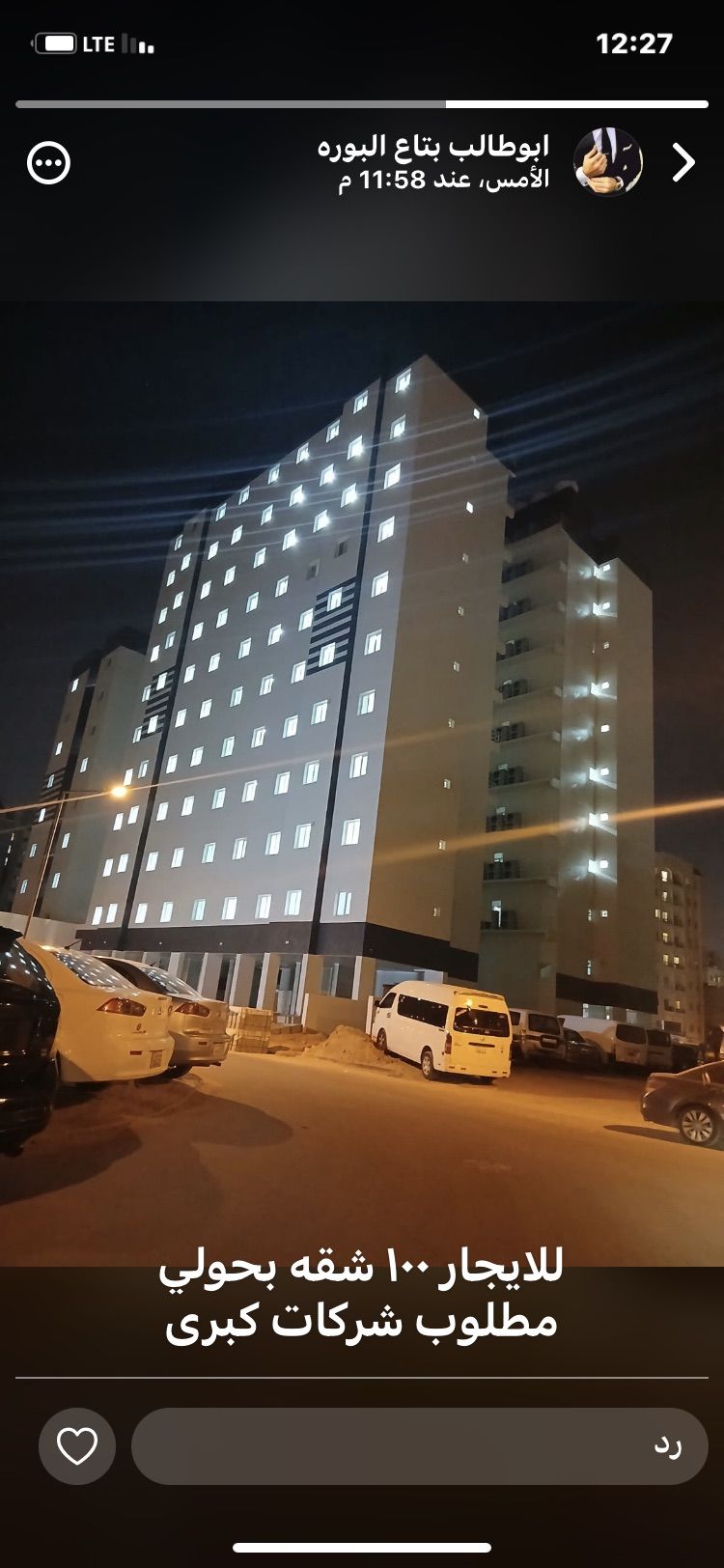 For rent, an apartment in Hawally, Block 12, with two rooms, a hall, two bathrooms, a kitchen, and a balcony. Basement parking is available. The rent includes electricity, water, and maintenance. The rent is 280 Kuwaiti dinars. For inquiries, contact Abu Mohammed