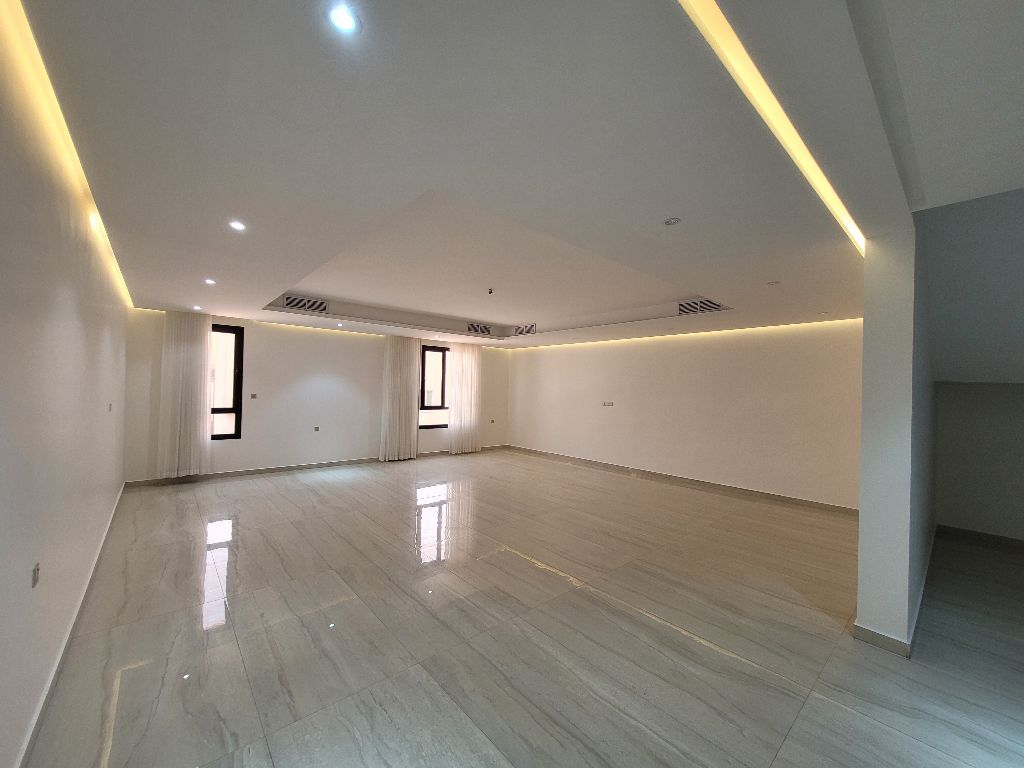 A modern duplex apartment is available for rent in Al - Surra. It features a large living room with stairs leading to the bedrooms, a guest bathroom, and a large kitchen with a storage area on the first floor. There are four master bedrooms with bathrooms, a maid's room with a bathroom, a laundry room, a storage room, and three dedicated parking spaces. The rent is 1400 Kuwaiti Dinars. Please do not