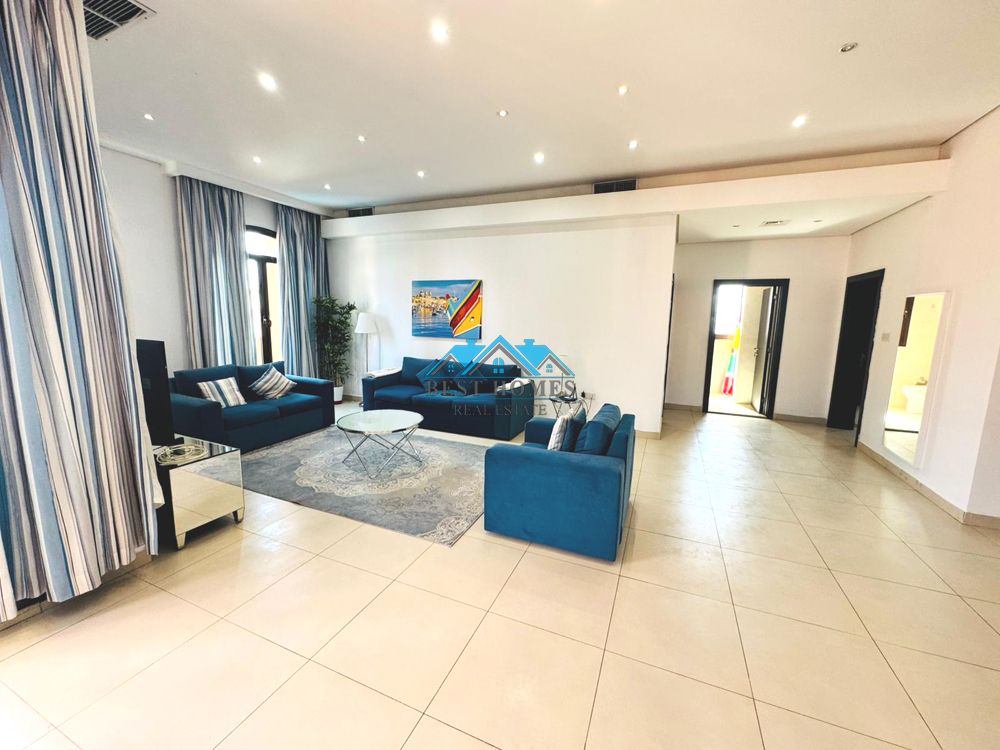 A modern furnished apartment with two bedrooms in Al-Mahboula. It includes a living room, kitchen, one master bedroom, one bedroom with a shared bathroom, weekly cleaning three times, a shared swimming pool, internet included, and one parking space. The rent is 700 Kuwaiti dinars.