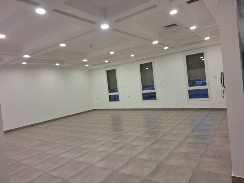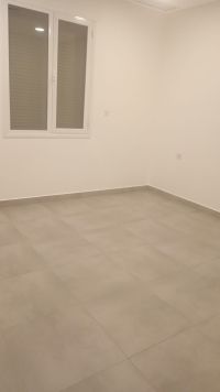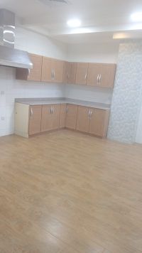 For rent: A ground floor apartment in Al-Salam, Area 2, consisting of 4 bedrooms, including two master bedrooms with walk-in closets and two bedrooms sharing a bathroom. It has a large living room with sinks and a guest bathroom, a large equipped kitchen, a maid's room, a laundry room, and 7 parking spaces. The rent is 1100 Kuwaiti Dinars, including services.