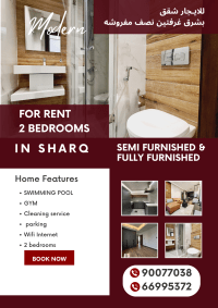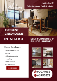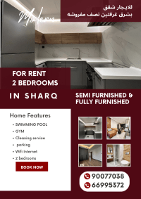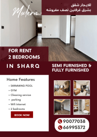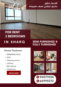 For rent in Sharq - luxurious 2 bedroom semi-furnished apartment. It consists of a big living room, 2 master bedrooms with 2 bathrooms, a fully equipped kitchen, a maid's room with a bathroom, swimming pool, gym, and 24-hour security. Rent starts from 650 to 700 depending on the floor, plus a one-month deposit and half-month realtor fees. Call for viewing.