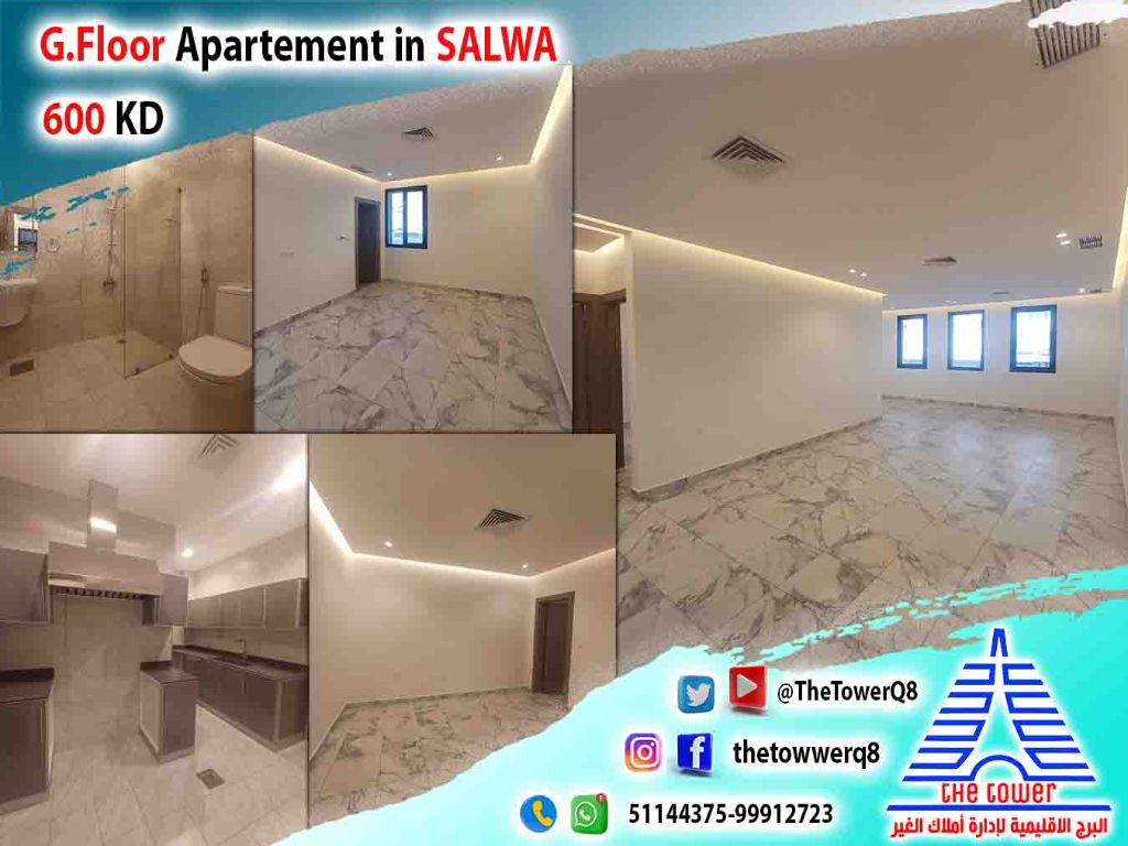 For rent in Salwa, a ground floor apartment with a small yard - new finishing, super deluxe - first occupant - 3 master bedrooms - large living room with guest bathroom - maid's room with bathroom - equipped kitchen - shaded parking. Rent is 600 KD. For inquiries.