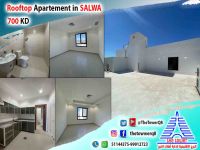For rent in Salwa, an apartment with a roof - new finishing, super deluxe - first occupant - 4 bedrooms (including two master bedrooms - two bedrooms sharing a bathroom) - large living room - maid's room with bathroom - equipped kitchen - shaded parking. Rent is 700 KD. For inquiries.