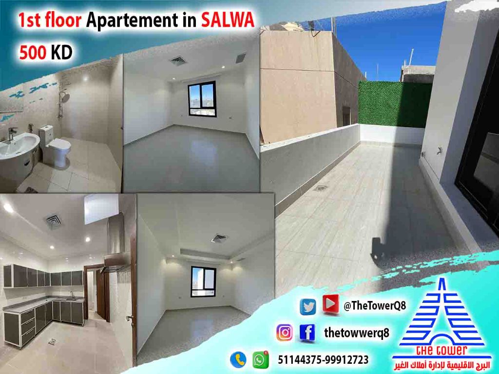 For rent in Salwa, a first-floor apartment with 3 balconies - new finishing, super deluxe - first occupant - 3 bedrooms (including a master bedroom - two rooms with a shared bathroom) - large living room - maid's room with bathroom - equipped kitchen - shaded parking. Rent is 500 KD. For inquiries.