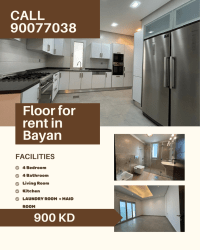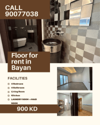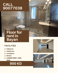 Floor for rent in Bayan for expat families. Big living room, guest bathroom, fully equipped kitchen, maid room with bathroom, laundry room, 1 master bedroom with bathroom, 3 bedrooms, bathroom, 2 balconies, 2 parking spots. Rent KD900 + one month deposit, realtor fees half month. Call for more details and viewing.