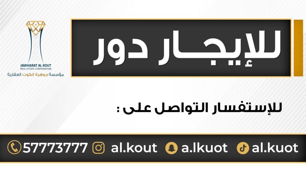 For rent: a luxurious floor with a roof, high-end finishing in Al Qadisiyah. It consists of three large master bedrooms with closets, a dedicated dressing room equipped with closets and a dressing table, a full kitchen with an electric stove, a laundry room, a maid's room with a bathroom, a driver's room with an external bathroom, high-end finishes with shutters for all windows, two large balconies with a beautiful view of the capital's towers, and four parking spaces. The price is 1000 dinars.
