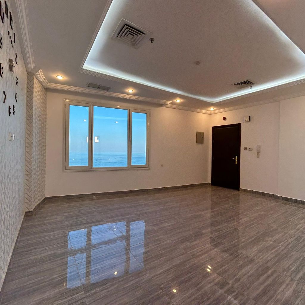 A residential apartment with a sea view for rent in Salmiya, a very prime location. Excellent finishing, easy access, consisting of a hall, 2 bedrooms, a kitchen, 2 bathrooms including a guest bathroom, a maid's room. The building features a reception lobby, surveillance cameras, elevators, and parking spaces. Rent includes water, electricity, and maintenance. Rent is 450 Kuwaiti Dinars, company commission applies.