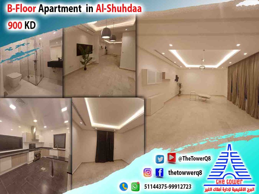 For rent in Al Shuhada, a ground floor with a courtyard open on four sides - part of a villa with front and back access - very high-end finishing - prime location - easy entrance and exit - 4 master bedrooms - large living room with guest bathroom and laundry area + dining room - maid's room with bathroom - separate laundry room - kitchen equipped with appliances - covered parking. Rent is 900 KWD. For inquiries.