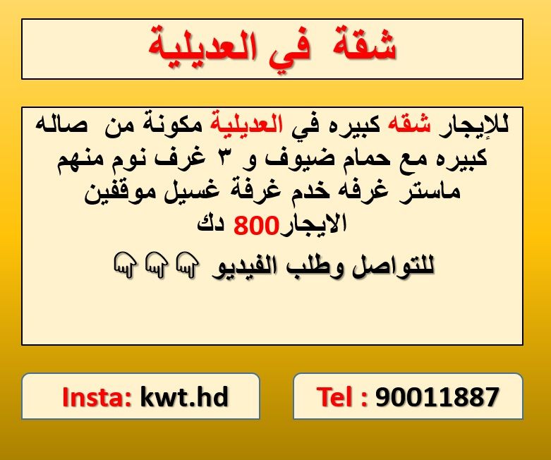 For rent An apartment in Al - Adailiya with spacious areas. It consists of 3 bedrooms, including 1 master bedroom, a maid's room with its own bathroom, a large living room, and a fully equipped kitchen. It has an elevator and parking. The rent is KD750 final. For contact