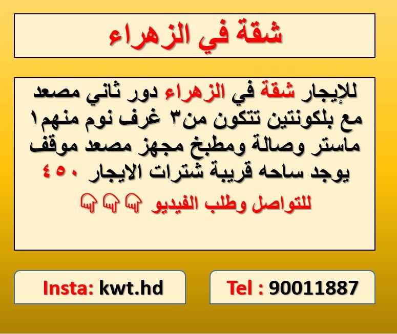 For rent, an apartment in Al Zahra, first floor with elevator. It consists of 3 bedrooms, including 2 master bedrooms and a maid's room, a large living room, and a fully equipped kitchen. It has an elevator and shaded parking. The rent is 450. For contact