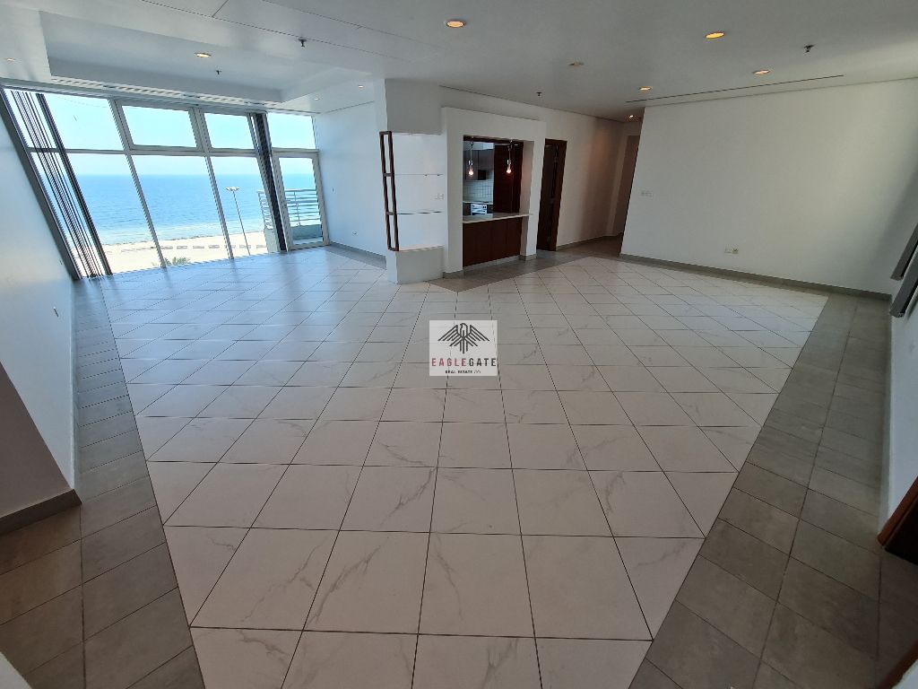 A fantastic, spacious 3-bedroom apartment with a balcony and an amazing sea view located in Mangaf. It has 3 bedrooms (1 master bedroom with its own bathroom and 2 bedrooms with a shared bathroom), 2 bathrooms total, 1 living room with access to the balcony, 1 guest toilet, 1 kitchen, 1 maid's room with its own bathroom, and 1 storage room. Building facilities include a swimming pool, gym, and shaded parking for 2 cars. Price: KD 800 per month.