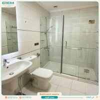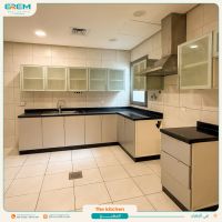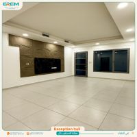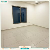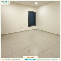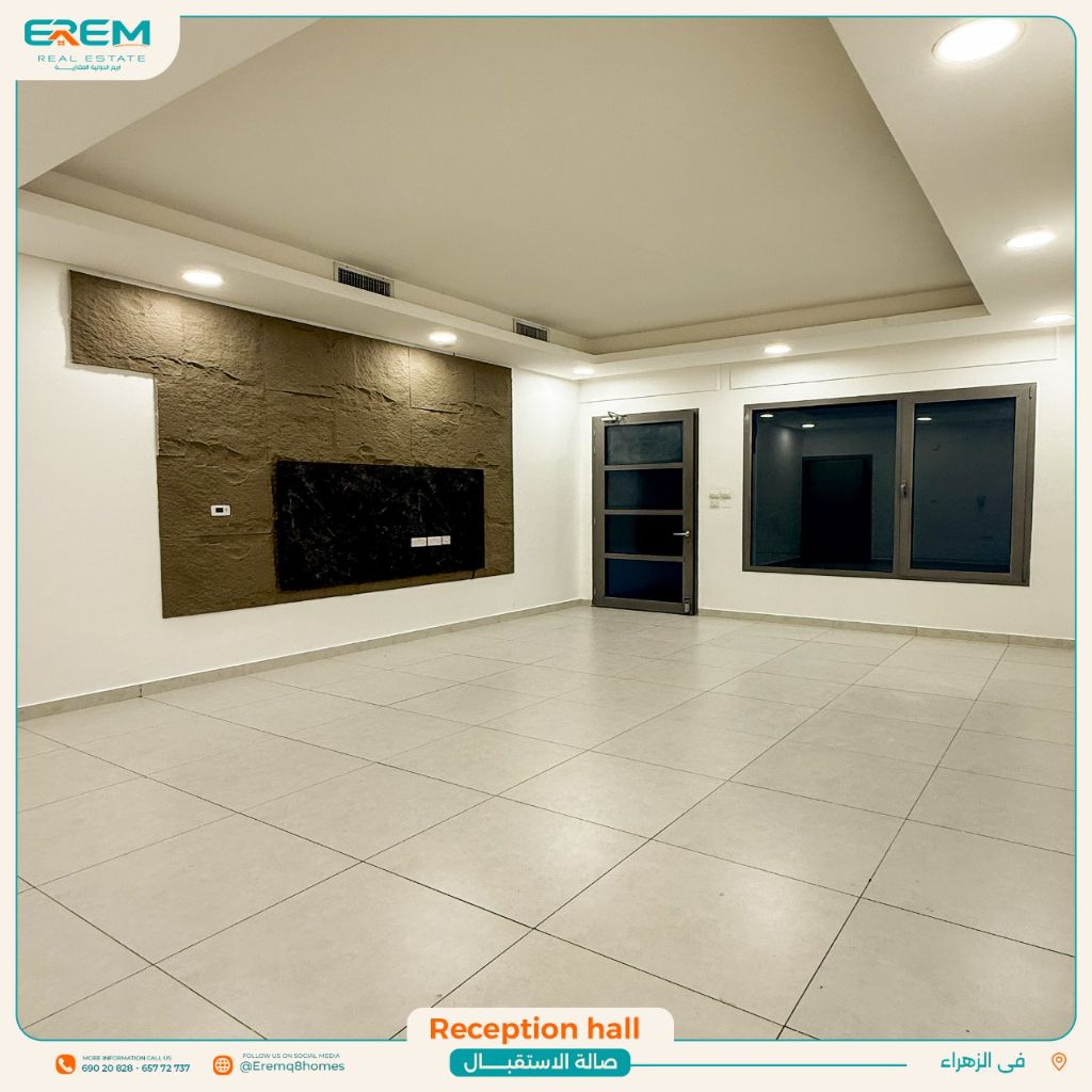 For rent in Al Zahra, an apartment with a courtyard, super deluxe finishing, consisting of a living room, 3 bedrooms including a master bedroom, a kitchen, a maid's room with a bathroom, and shaded parking. The rent is 550 Kuwaiti Dinars.