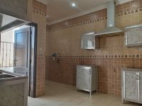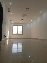 For rent, a large apartment in Hitteen consisting of a living room with a guest bathroom and sink, a hallway, 3 bedrooms including a master bedroom and two bedrooms sharing a bathroom, a maid's room, a fully equipped kitchen, a laundry area, a small balcony in the kitchen, and two shaded parking spots side by side. Rent is 500 Kuwaiti Dinars. Brokers are prohibited.