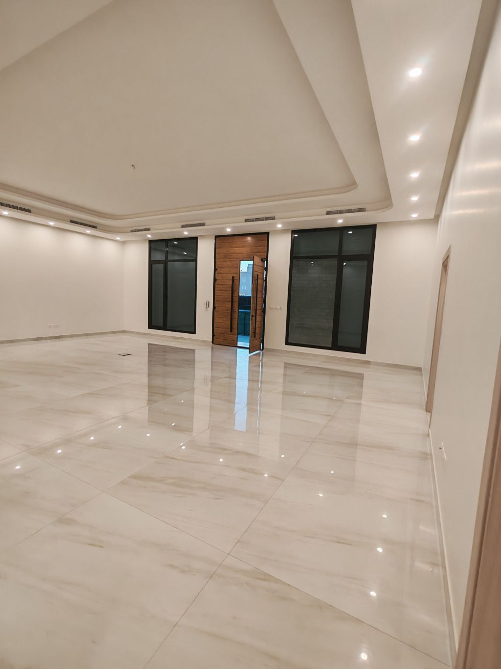 For rent in Al-Nuzha, first floor with a balcony (super deluxe finishing - new, first occupant). It consists of 4 master bedrooms, a large living room with a balcony, a guest bathroom and sink, a fully equipped kitchen, a laundry room, and a maid's room with its own bathroom. Includes air conditioning, central heating, shutters, shower box, and two shaded parking spaces. Rent is 1150 dinars plus a security deposit, and we have more available.