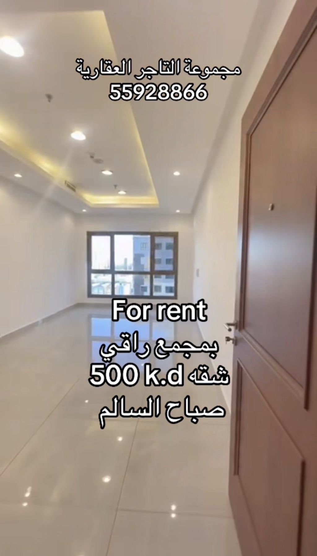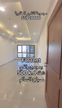 For rent: An apartment in a residential complex in Sabah Al-Salem with 3 bedrooms, including a master bedroom, a large living room, a guest bathroom, a fully equipped kitchen, a maid's room with its own bathroom, two elevators, swimming pools, a gym, and two parking spaces. The rent is 500 KD final.