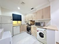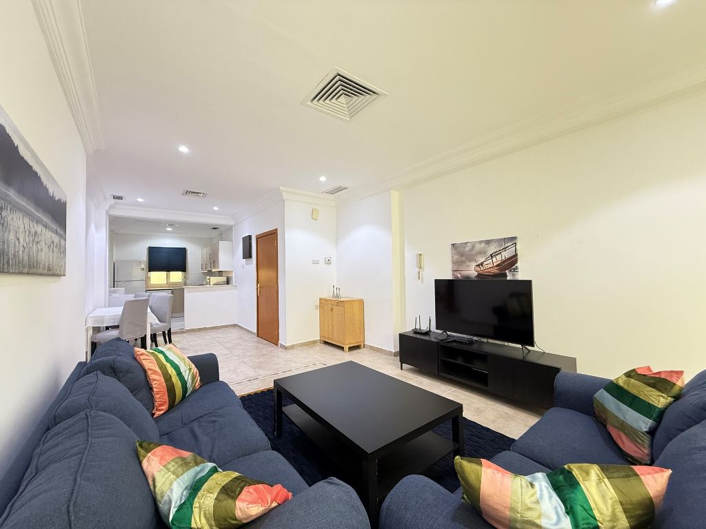 A furnished apartment in the Al-Mangaf area with two bedrooms, two bathrooms, an open kitchen, a private garden, a shared swimming pool, and a gym. The rent is 450 Kuwaiti dinars per month for a long-term contract. Available for foreign residents only. Furniture color may vary. Please contact Horizon Q8 Real Estate Company. A security deposit equal to one month's rent and agency fees equivalent to half a month's rent apply. The map location is for guidance purposes.