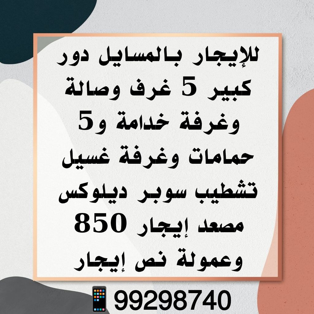 For rent in Al-Masayel, a large floor with 5 rooms, a hall, a domestic worker's room, 5 bathrooms, and a laundry room. Super deluxe finishing. Elevator. Rent is 850, and the commission is half the rent.