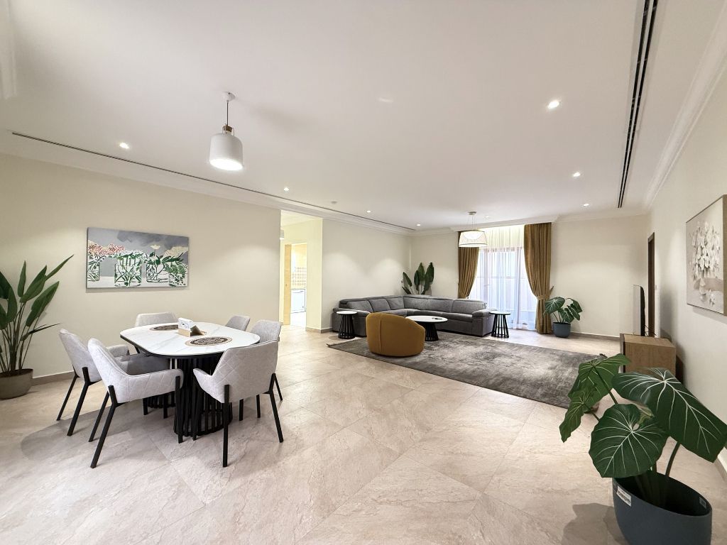 Al-Surra - A large, beautiful, and furnished apartment with a shared pool. It contains 4 bedrooms, 3.5 bathrooms, a large living and dining area, a fully equipped kitchen, a maid's room with a shower, and two balconies. There is an outdoor pool, a gym, and underground parking. For foreign residents, the rent is 1200 Kuwaiti Dinars per month. Please contact Horizon KW8 Real Estate Company. A security deposit equal to one month's rent and real estate fees are required.