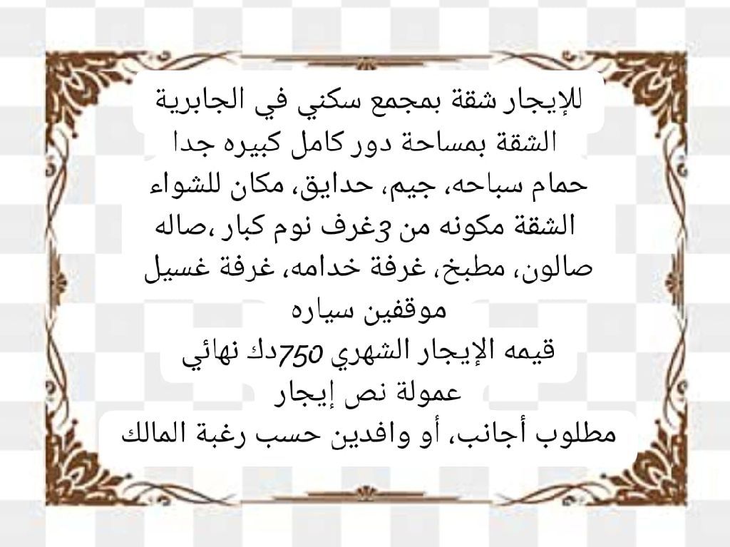 For rent: An apartment in Al Jabriya, a full floor area in a fully integrated residential complex with a swimming pool, gym, walking path, and garden. The apartment consists of 3 bedrooms, a very large living room with a guest bathroom, kitchen, and a maid's room. The monthly rent is 750 KD + half a month's rent as commission. Note: Only expatriates or foreigners are required, according to the owner's preference. Phone.