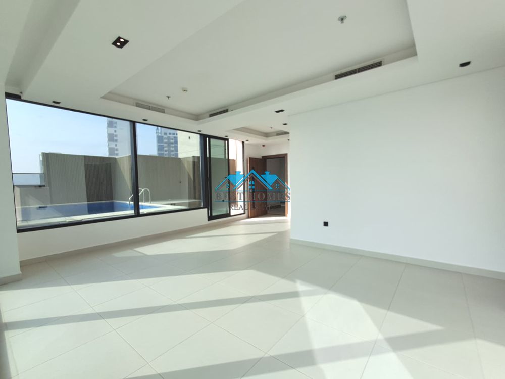 A 2-bedroom apartment with a private swimming pool in Hessa Al Mubarak. It has a good-sized living area, a kitchen, no maid's room, a big private terrace area with a private swimming pool, and a sea view. Rent is KD 1350. Call or WhatsApp for viewing.