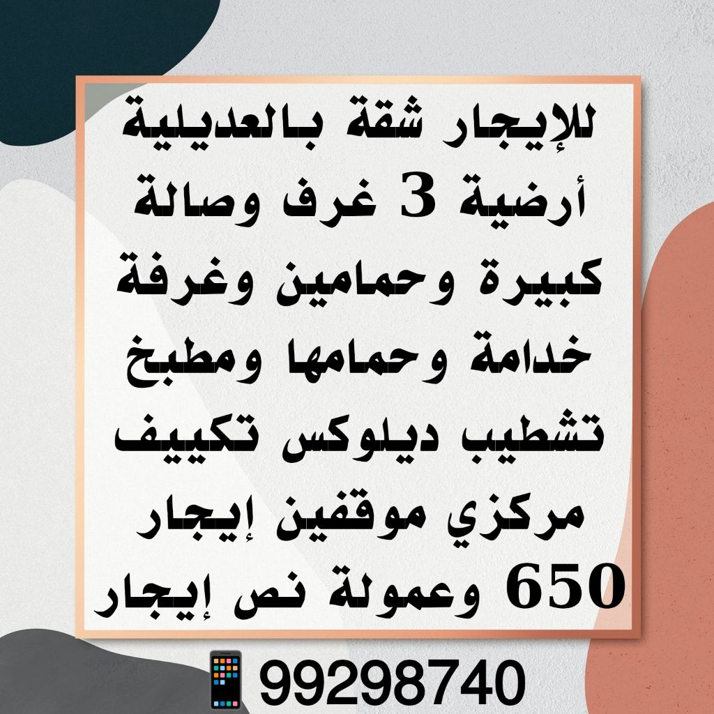 For rent: A ground-floor apartment in Adailiya with 3 bedrooms, a large living room, two bathrooms, a maid's room with its own bathroom, and a kitchen. Deluxe finishing, central air conditioning, and two parking spaces. Rent is 650, with a commission of half the rent.